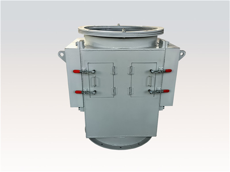 物料经过本设备时,经除铁器中心分流板把物料分流到管道除铁器的磁场覆盖区,铁磁性物质被吸附在管道壁上,清除铁磁性物时打开侧门,把铁磁性物质取出即可。